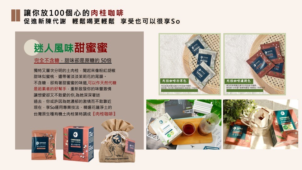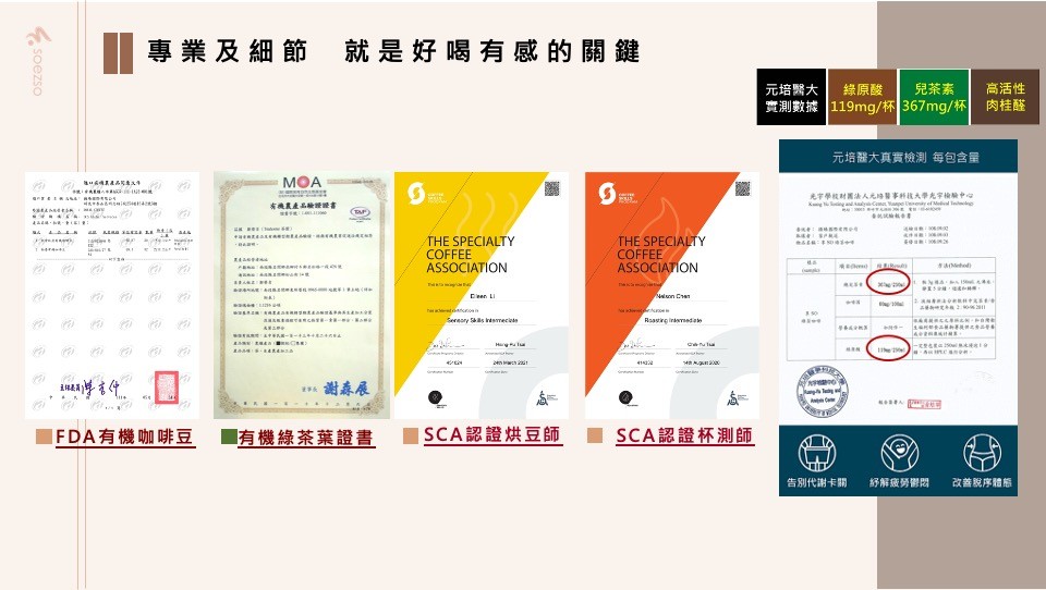 好喝順口又不會苦澀,不含糖分適合天天喝沒負擔,最重要的是經過元培醫學大學真實檢測,每包享So綠茶咖啡裡特有的綠原酸含量高達119mg、兒茶素含量高達367mg、加上茶氨酸及咖啡因這四大黃金元素的相輔相成,天天幫身體自然提高代謝力超級給力!