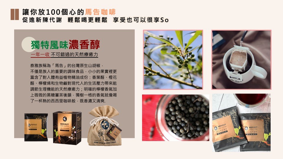 1-綠茶咖啡(濾掛)一盒。 2-綠茶咖啡(冷萃)一盒。3-肉桂咖啡(濾掛)一盒。 4-馬告咖啡(濾掛)一盒。